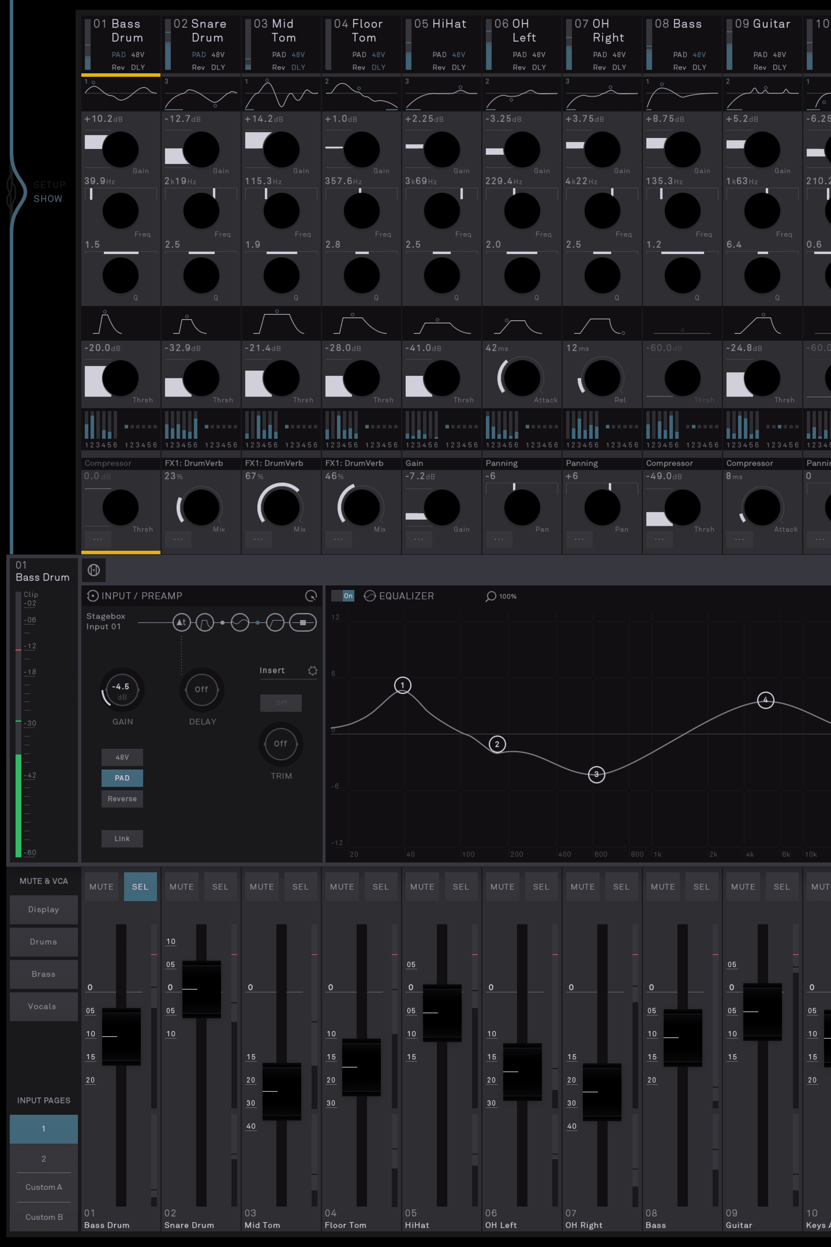 In order to adapt the console to the typical workflow of a sound engineer, we divided the interface into two essential modes, making it easier to get a quick overview and display information in a less hierarchical way. Setup Mode contains all the basic functions that need to be set up before an event and don't need to be changed again. Show Mode focuses solely on the live situation. It allows fast interaction and direct access to relevant console parameters and functions.